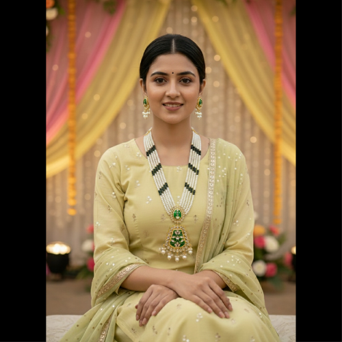 This elegant long necklace set features four strands of lustrous faux pearls accented with bottle green beads. The centerpiece is a stunning, geometric pendant with classic Kundan-style work and vibrant green hand-painted enamel (Meenakari).