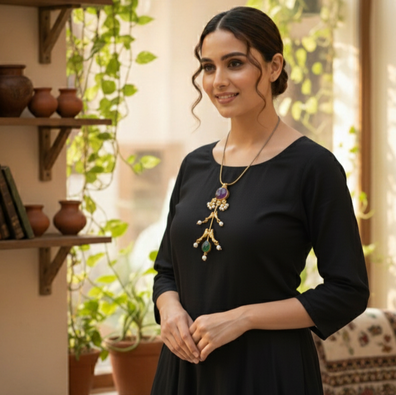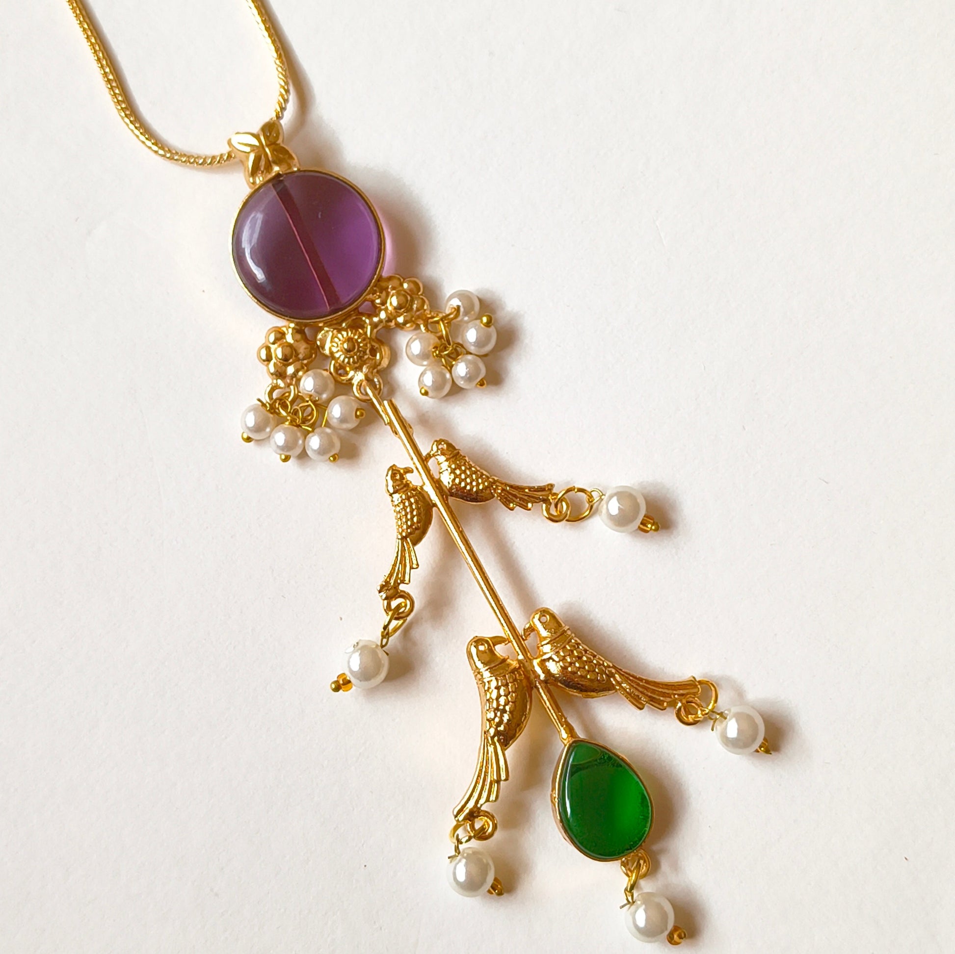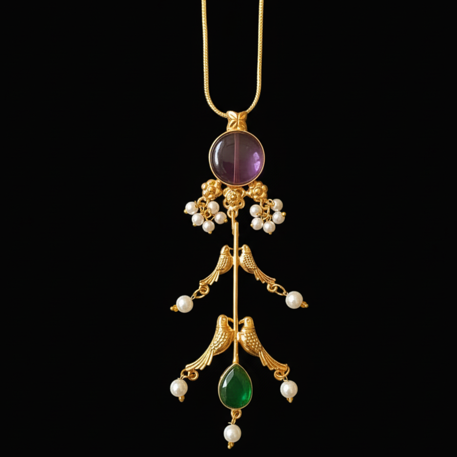 A magnificent statement necklace featuring a jeweled bird and trailing stone & pearl accents on a delicate gold chain. Its intricate, nature-inspired design embodies freedom, joy, and aesthetic connection. A subtle yet striking piece to effortlessly elevate any look.